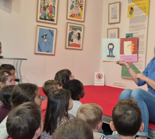 Nous avons également pris le bus de ville pour aller à la médiathèque voir l'exposition Grande ! Nous avons écouté les histoires d'Aurore Petit lues par Laurence : une maman c'est comme une maison, Ma sœur est un diplodocus, Colère, Orange. Nous avons regardé les tableaux et nous avons fait des petits jeux.